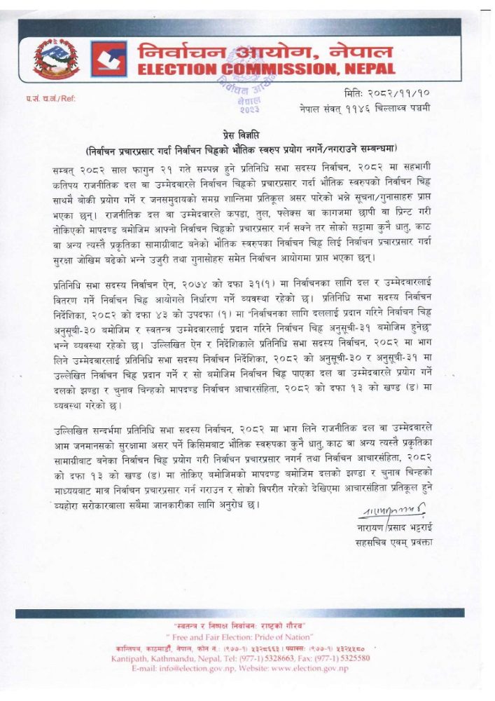 तर धातु, काठ वा अन्य कडा सामग्रीबाट तयार गरिएका चिह्न बोकेर वा प्रदर्शन गरेर प्रचार गर्दा सुरक्षामा जोखिम उत्पन्न हुन सक्ने भन्दै त्यस्तो अभ्यास नगर्न आग्रह गरिएको छ। ‘प्रतिनिधिसभा सदस्य निर्वाचन, २०८२’ मा सहभागी दल तथा उम्मेदवारलाई लक्षित गर्दै आयोगले सर्वसाधारणको सुरक्षामा असर पुग्ने खालका भौतिक संरचनायुक्त चुनाव चिह्न प्रयोग नगर्न निर्देशन दिएको छ।