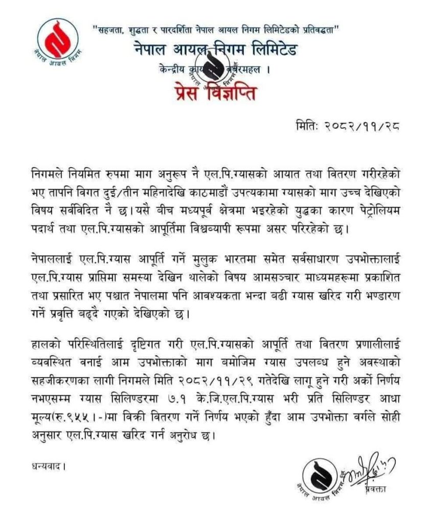 नेपाल आयल निगम लिमिटेड ले काठमाडौं उपत्यकामा पछिल्लो समय एलपी ग्यासको माग अत्यधिक बढेपछि ग्यासको आपूर्ति व्यवस्थापनका लागि अस्थायी व्यवस्था लागू गरेको जनाएको छ। निगमले जारी गरेको प्रेस विज्ञप्तिअनुसार नियमित रूपमा मागअनुसार एलपी ग्यास आयात तथा वितरण भइरहे पनि पछिल्लो दुई–तीन महिनादेखि काठमाडौं उपत्यकामा ग्यासको माग असामान्य रूपमा बढेको छ। यसैबीच मध्यपूर्व क्षेत्रमा जारी युद्धका कारण पेट्रोलियम पदार्थ तथा एलपी ग्यासको आपूर्तिमा विश्वव्यापी प्रभाव परेको निगमले जनाएको छ।