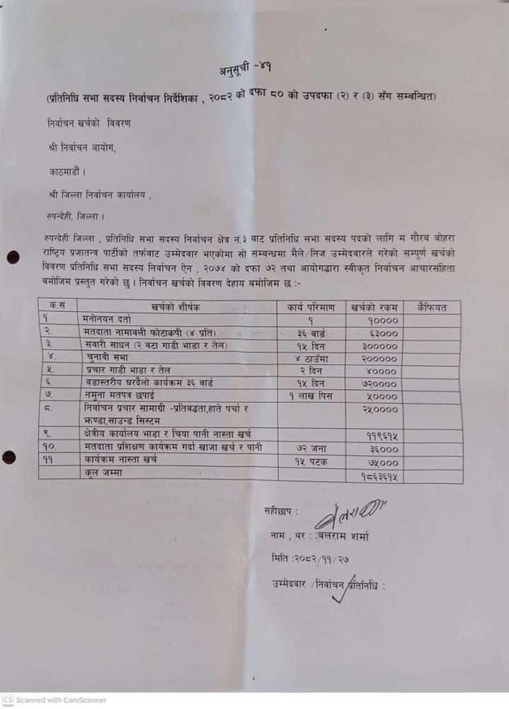 पेश गरिएको विवरणअनुसार उम्मेदवार बोहराले निर्वाचन अवधिभर १८ लाख ६३ हजार ६१५ रुपैयाँ खर्च भएको जानकारी दिएका छन्। निर्वाचन आयोगको प्रावधानअनुसार सबै उम्मेदवारले निर्वाचनपछि आफ्नो खर्चको विवरण सार्वजनिक गर्नुपर्ने व्यवस्था रहेको छ। उक्त खर्च विवरण उम्मेदवारका निर्वाचन प्रतिनिधि बलराम शर्मामार्फत जिल्ला निर्वाचन कार्यालयमा बुझाइएको जनाइएको छ।