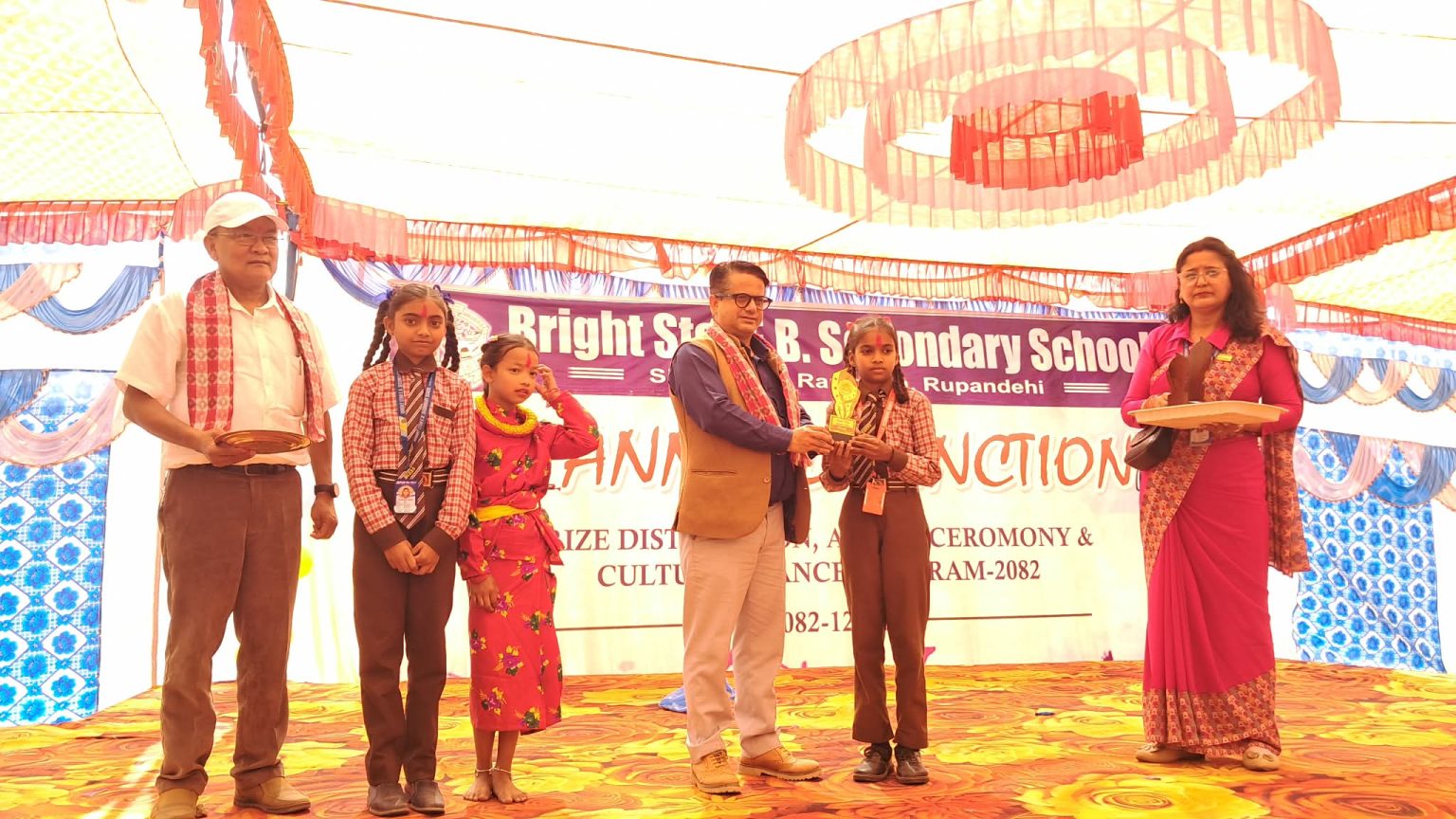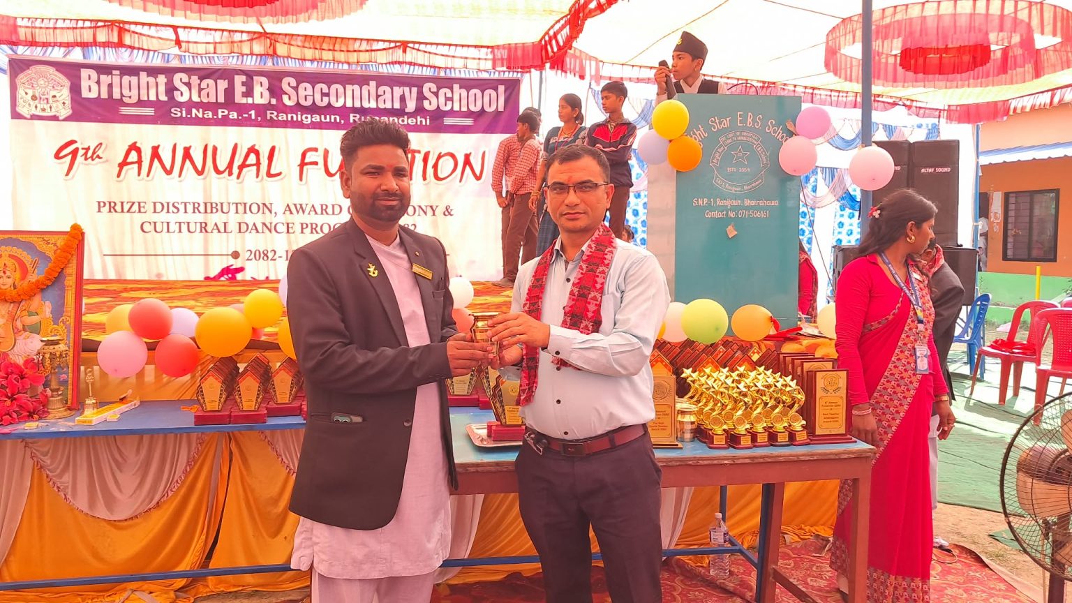 ब्राइट स्टार इंगलिस बोडिंग सेकेण्डरी स्कुल सिनपा १ रानीगाउं रुपन्देहीको ९ औं बार्षिक उत्सव, अभिभावक दिवस तथा पुरस्कार वितरण एवम सांस्कृतिक कार्यक्रम २०८२ बुधबार एक कार्यक्रमका बिच उत्साहजनक वातावरणमा सम्पन्न भएको छ । बिद्यालयका प्रबन्ध निर्देशक अमित यादवको अध्यक्षता तथा नेशनल प्याब्सनका केन्द्रीय सचिव विष्णु पौडेलको प्रमुख आतिथ्यतामा बुधबार बिद्यालयमा ९ औं बार्षिक उत्सव, अभिभावक दिवस तथा पुरस्कार वितरण एवम सांस्कृतिक कार्यक्रम २०८२ सम्पन्न भएको हो । कार्यक्रमको उदघाटन गर्नु हुदै उदघाटन सत्रका प्रमुख अतिथी एनप्याब्सन रूपन्देहीका जिल्ला अध्यक्ष बाबूराम बन्जाडेले विद्यालयले छोटो समयमै हासिल गरेको उपलब्धि प्रशंसनीय रहेको बताउनुभएको छ । उहाँले विद्यालय व्यवस्थापन, शिक्षक तथा अभिभावकबीचको सहकार्यले मात्र उत्कृष्ट शैक्षिक वातावरण सिर्जना हुने बताउँदै आगामी दिनमा अझ उत्कृष्ट नतिजा आउने विश्वास व्यक्त गर्नुभएको छ ।